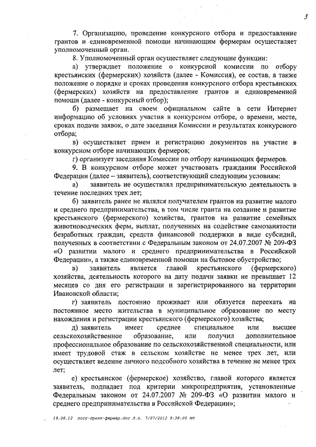 Постановление Правительства Ивановской области от 08.06.2012 N 194-п "Об утверждении Порядка предоставления начинающим фермерам грантов на создание и развитие крестьянского (фермерского) хозяйства и единовременной помощи на бытовое обустройство, одним из источников финансового обеспечения которых является субсидия из федерального бюджета"