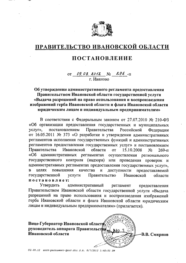 Постановление Правительства Ивановской области от 09.08.2012 N 296-п "Об утверждении административного регламента предоставления Правительством Ивановской области государственной услуги "Выдача разрешений на право использования и воспроизведения изображений герба Ивановской области и флага Ивановской области юридическим лицам и индивидуальным предпринимателям"