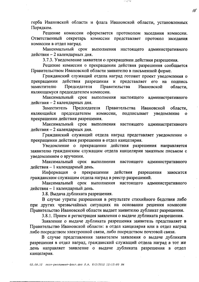Постановление Правительства Ивановской области от 09.08.2012 N 296-п "Об утверждении административного регламента предоставления Правительством Ивановской области государственной услуги "Выдача разрешений на право использования и воспроизведения изображений герба Ивановской области и флага Ивановской области юридическим лицам и индивидуальным предпринимателям"