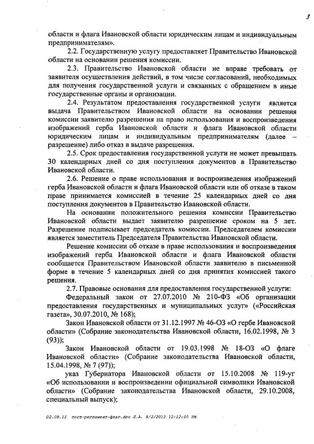 Постановление Правительства Ивановской области от 09.08.2012 N 296-п "Об утверждении административного регламента предоставления Правительством Ивановской области государственной услуги "Выдача разрешений на право использования и воспроизведения изображений герба Ивановской области и флага Ивановской области юридическим лицам и индивидуальным предпринимателям"