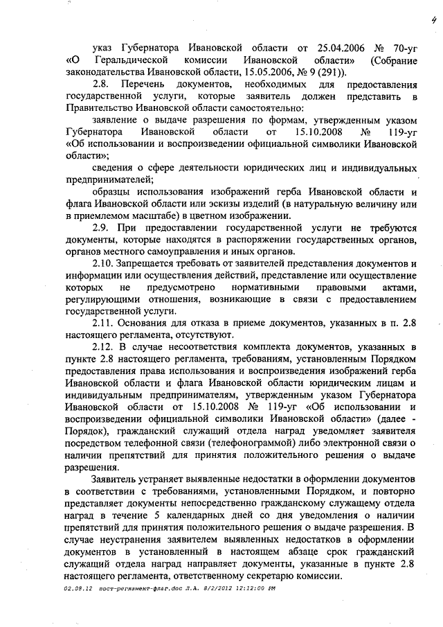 Постановление Правительства Ивановской области от 09.08.2012 N 296-п "Об утверждении административного регламента предоставления Правительством Ивановской области государственной услуги "Выдача разрешений на право использования и воспроизведения изображений герба Ивановской области и флага Ивановской области юридическим лицам и индивидуальным предпринимателям"