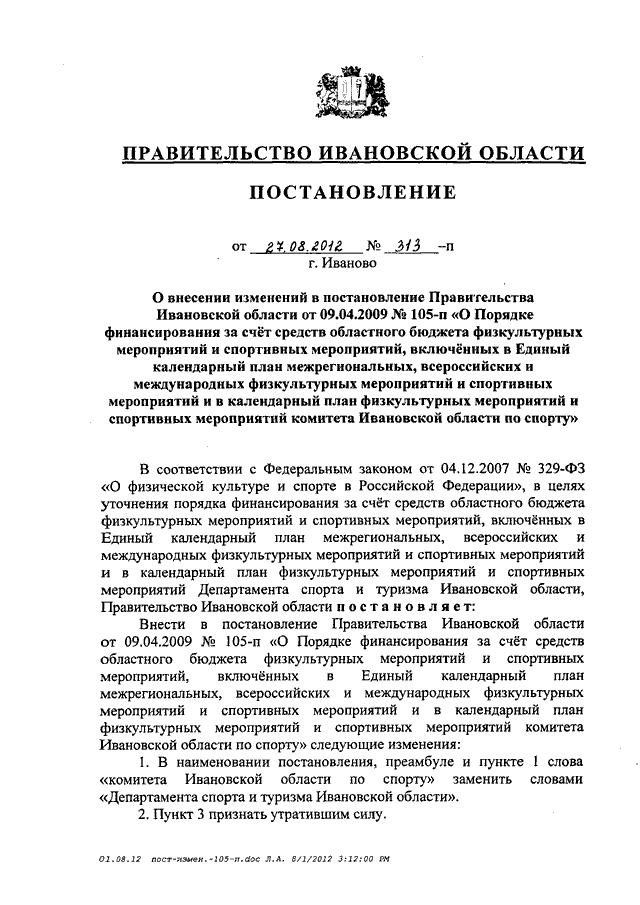 Постановление Правительства Ивановской области от 27.08.2012 N 313-п "О внесении изменений в постановление Правительства Ивановской области от 09.04.2009 N 105-п "О Порядке финансирования за счет средств областного бюджета физкультурных мероприятий и спортивных мероприятий, включенных в Единый календарный план межрегиональных, всероссийских и международных физкультурных мероприятий и спортивных мероприятий и в календарный план физкультурных мероприятий и спортивных мероприятий комитета Ивановской области по спорту"