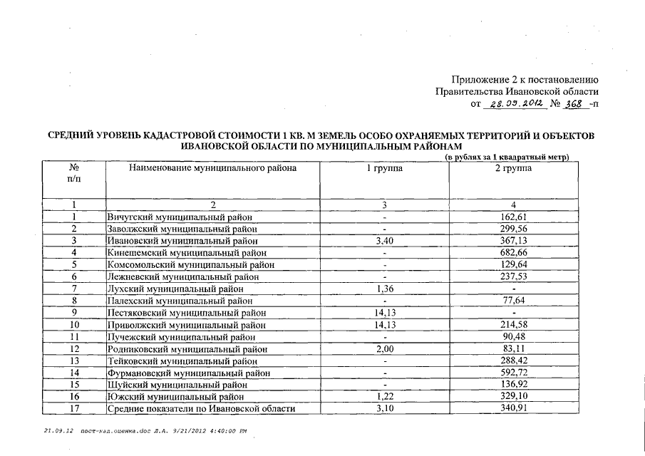 Постановление Правительства Ивановской области от 28.09.2012 N 368-п "Об утверждении результатов государственной кадастровой оценки земель особо охраняемых территорий и объектов Ивановской области"