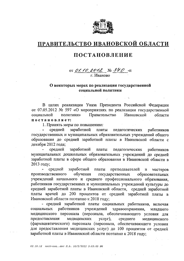Постановление Правительства Ивановской области от 01.10.2012 N 370-п "О некоторых мерах по реализации государственной социальной политики"