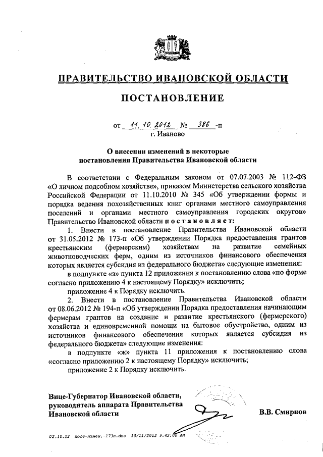 Постановление Правительства Ивановской области от 11.10.2012 N 386-п "О внесении изменений в некоторые постановления Правительства Ивановской области"