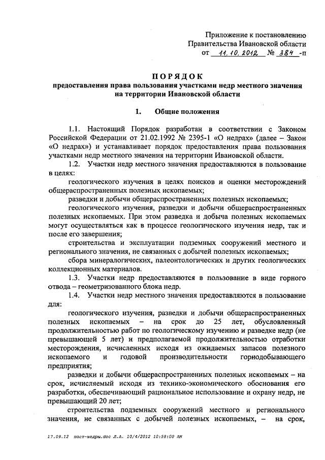 Постановление Правительства Ивановской области от 11.10.2012 N 384-п "О Порядке предоставления права пользования участками недр местного значения на территории Ивановской области"