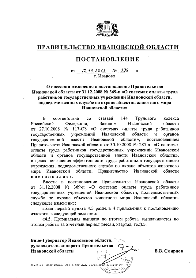 Постановление Правительства Ивановской области от 17.10.2012 N 398-п "О внесении изменения в постановление Правительства Ивановской области от 31.12.2008 N 369-п "О системах оплаты труда работников государственных учреждений Ивановской области, подведомственных службе по охране объектов животного мира Ивановской области"