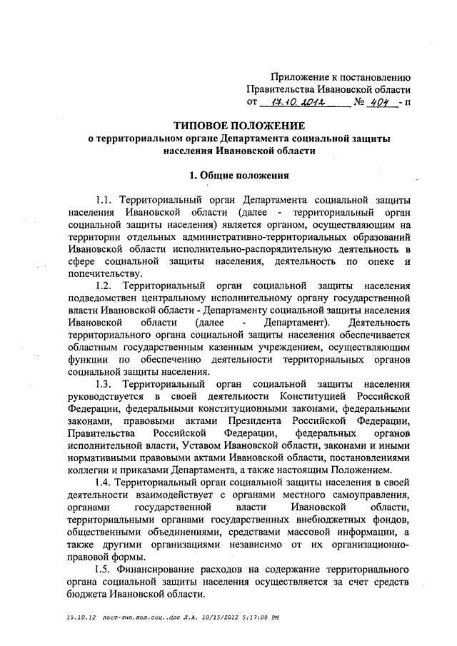 Постановление Правительства Ивановской области от 17.10.2012 N 404-п "Об утверждении Типового положения о территориальном органе Департамента социальной защиты населения Ивановской области"