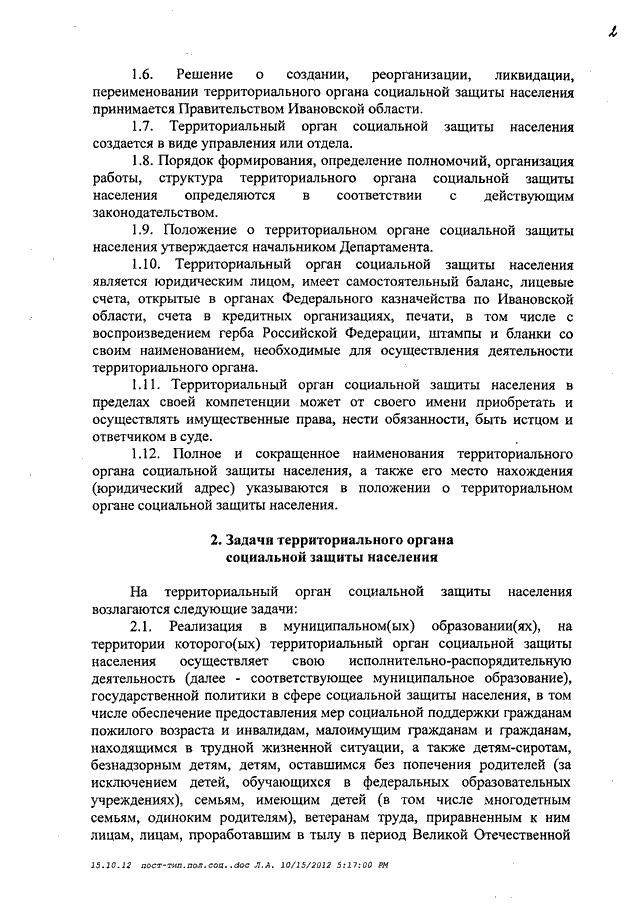 Постановление Правительства Ивановской области от 17.10.2012 N 404-п "Об утверждении Типового положения о территориальном органе Департамента социальной защиты населения Ивановской области"