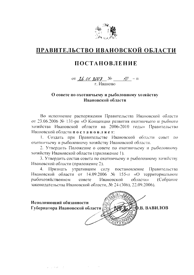 Постановление Правительства Ивановской области от 26.01.2007 N 10-п "О совете по охотничьему и рыболовному хозяйству Ивановской области" (вместе с "Положением о совете по охотничьему и рыболовному хозяйству Ивановской области")