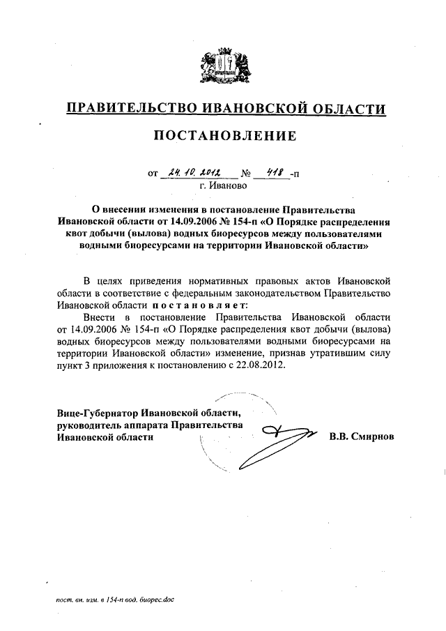 Постановление Правительства Ивановской области от 24.10.2012 N 418-п "О внесении изменения в постановление Правительства Ивановской области от 14.09.2006 N 154-п "О Порядке распределения квот добычи (вылова) водных биоресурсов между пользователями водными биоресурсами на территории Ивановской области"