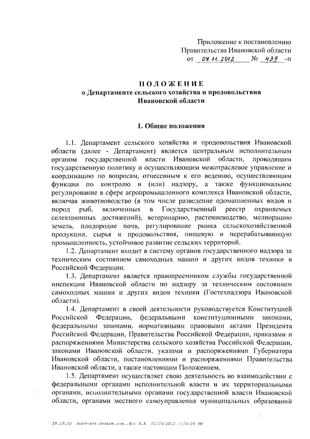 Постановление Правительства Ивановской области от 07.11.2012 N 439-п "Об утверждении Положения о Департаменте сельского хозяйства и продовольствия Ивановской области"