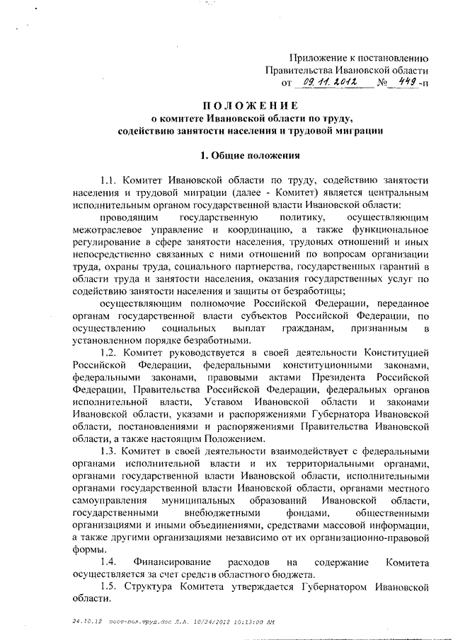 Постановление Правительства Ивановской области от 09.11.2012 N 449-п "Об утверждении Положения о комитете Ивановской области по труду, содействию занятости населения и трудовой миграции"