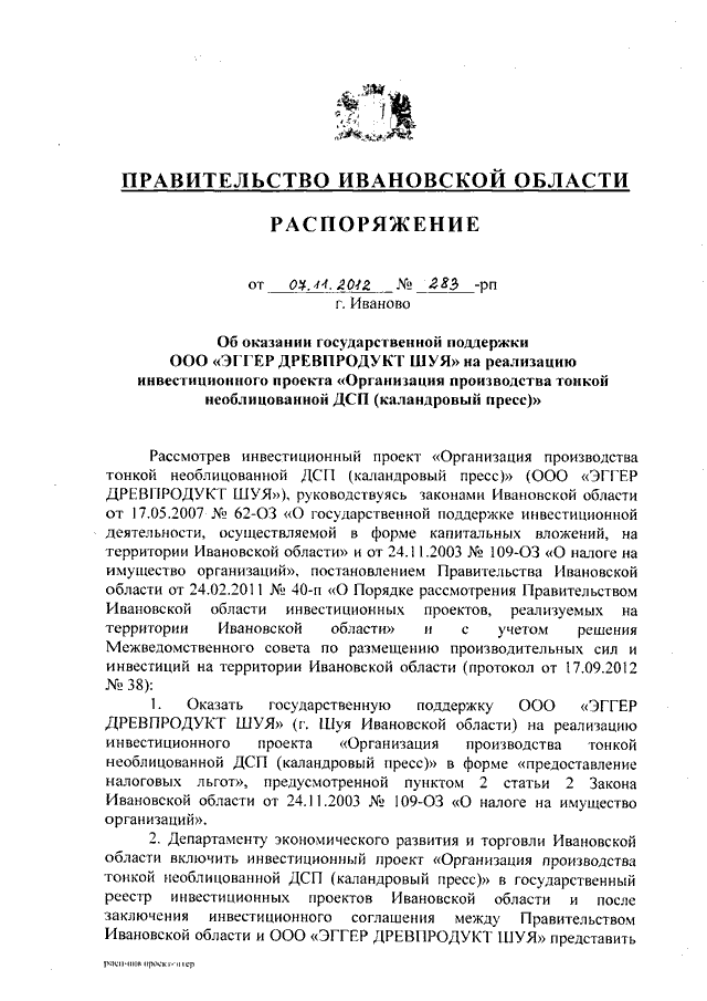 Распоряжение Правительства Ивановской области от 07.11.2012 N 283-рп "Об оказании государственной поддержки ООО "ЭГГЕР ДРЕВПРОДУКТ ШУЯ" на реализацию инвестиционного проекта "Организация производства тонкой необлицованной ДСП (каландровый пресс)"