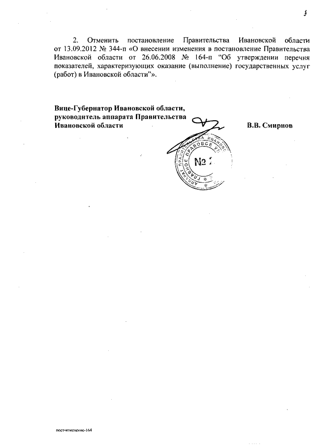 Постановление Правительства Ивановской области от 07.11.2012 N 440-п "О внесении изменения в постановление Правительства Ивановской области от 26.06.2008 N 164-п "Об утверждении перечня показателей, характеризующих оказание (выполнение) государственных услуг (работ) в Ивановской области"