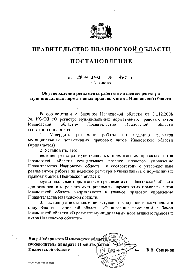 Постановление Правительства Ивановской области от 09.11.2012 N 450-п "Об утверждении регламента работы по ведению регистра муниципальных нормативных правовых актов Ивановской области"