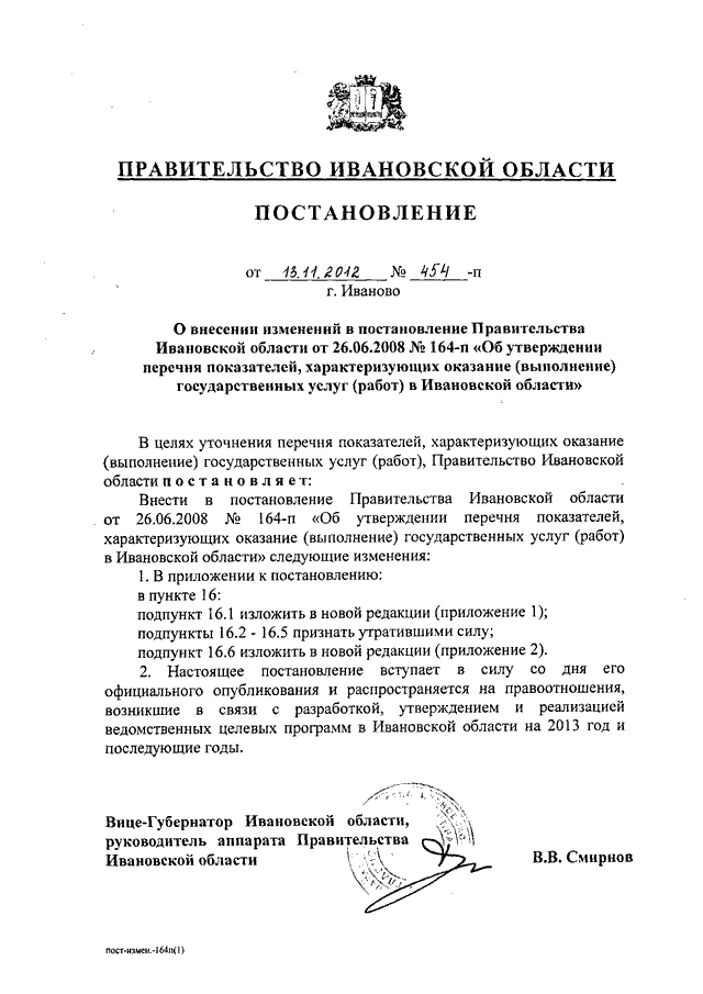 Постановление Правительства Ивановской области от 13.11.2012 N 454-п "О внесении изменений в постановление Правительства Ивановской области от 26.06.2008 N 164-п "Об утверждении перечня показателей, характеризующих оказание (выполнение) государственных услуг (работ) в Ивановской области"