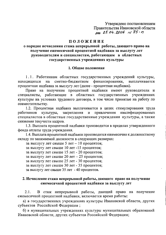 Постановление Правительства Ивановской области от 25.04.2006 N 75-п "Об утверждении Положения о порядке исчисления стажа непрерывной работы, дающего право на получение ежемесячной процентной надбавки за выслугу лет руководителям и специалистам, работающим в областных государственных учреждениях культуры"