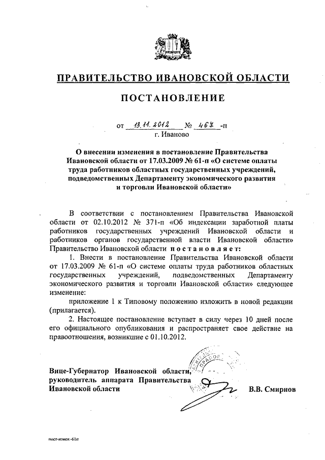 Постановление Правительства Ивановской области от 13.11.2012 N 467-п "О внесении изменения в постановление Правительства Ивановской области от 17.03.2009 N 61-п "О системе оплаты труда работников областных государственных учреждений, подведомственных Департаменту экономического развития и торговли Ивановской области" (вместе с "Перечнем профессиональных квалификационных групп должностей работников областных государственных учреждений, подведомственных Департаменту экономического развития и торговли Ивановской области")