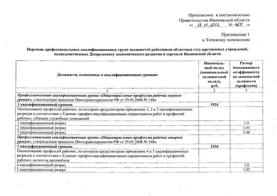 Постановление Правительства Ивановской области от 13.11.2012 N 467-п "О внесении изменения в постановление Правительства Ивановской области от 17.03.2009 N 61-п "О системе оплаты труда работников областных государственных учреждений, подведомственных Департаменту экономического развития и торговли Ивановской области" (вместе с "Перечнем профессиональных квалификационных групп должностей работников областных государственных учреждений, подведомственных Департаменту экономического развития и торговли Ивановской области")