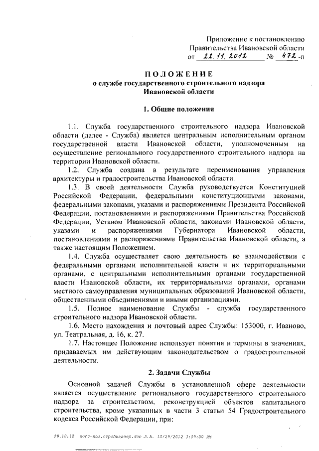 Постановление Правительства Ивановской области от 22.11.2012 N 472-п "Об утверждении Положения о службе государственного строительного надзора Ивановской области"