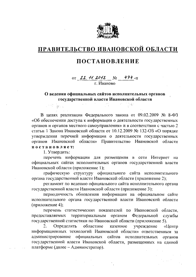 Постановление Правительства Ивановской области от 22.11.2012 N 474-п "О ведении официальных сайтов исполнительных органов государственной власти Ивановской области" (вместе с "Перечнем информации для размещения в сети Интернет на официальных сайтах исполнительных органов государственной власти Ивановской области", "Регламентом по ведению официального сайта исполнительного органа государственной власти Ивановской области", "Перечнем статистических показателей по Ивановской области, предоставляемых территориальным органом Федеральной службы государственной статистики по Ивановской области")