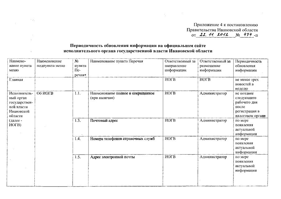 Постановление Правительства Ивановской области от 22.11.2012 N 474-п "О ведении официальных сайтов исполнительных органов государственной власти Ивановской области" (вместе с "Перечнем информации для размещения в сети Интернет на официальных сайтах исполнительных органов государственной власти Ивановской области", "Регламентом по ведению официального сайта исполнительного органа государственной власти Ивановской области", "Перечнем статистических показателей по Ивановской области, предоставляемых территориальным органом Федеральной службы государственной статистики по Ивановской области")