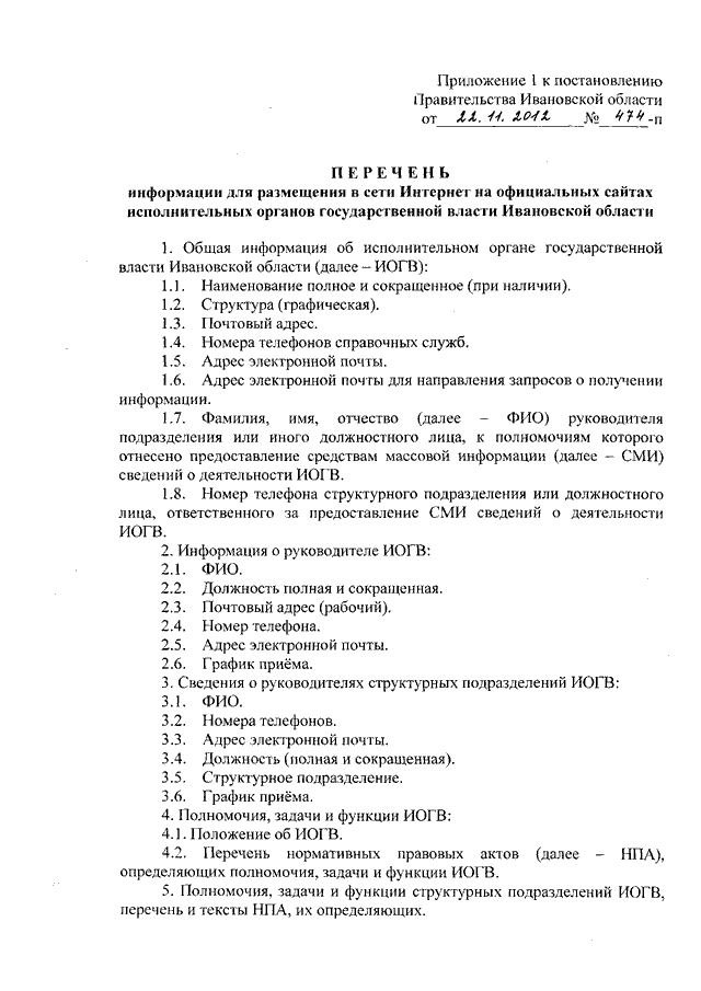 Постановление Правительства Ивановской области от 22.11.2012 N 474-п "О ведении официальных сайтов исполнительных органов государственной власти Ивановской области" (вместе с "Перечнем информации для размещения в сети Интернет на официальных сайтах исполнительных органов государственной власти Ивановской области", "Регламентом по ведению официального сайта исполнительного органа государственной власти Ивановской области", "Перечнем статистических показателей по Ивановской области, предоставляемых территориальным органом Федеральной службы государственной статистики по Ивановской области")