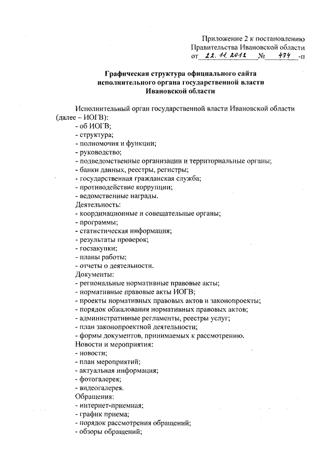 Постановление Правительства Ивановской области от 22.11.2012 N 474-п "О ведении официальных сайтов исполнительных органов государственной власти Ивановской области" (вместе с "Перечнем информации для размещения в сети Интернет на официальных сайтах исполнительных органов государственной власти Ивановской области", "Регламентом по ведению официального сайта исполнительного органа государственной власти Ивановской области", "Перечнем статистических показателей по Ивановской области, предоставляемых территориальным органом Федеральной службы государственной статистики по Ивановской области")