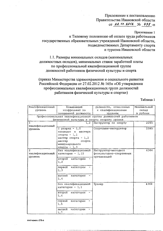 Постановление Правительства Ивановской области от 22.11.2012 N 475-п "О внесении изменения в постановление Правительства Ивановской области от 31.12.2008 N 378-п "О системе оплаты труда работников государственных образовательных учреждений Ивановской области, подведомственных Департаменту спорта и туризма Ивановской области"