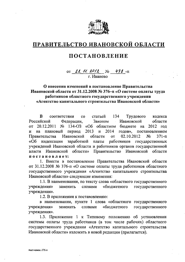 Постановление Правительства Ивановской области от 22.11.2012 N 478-п "О внесении изменений в постановление Правительства Ивановской области от 31.12.2008 N 376-п "О системе оплаты труда работников областного государственного учреждения "Агентство капитального строительства Ивановской области"