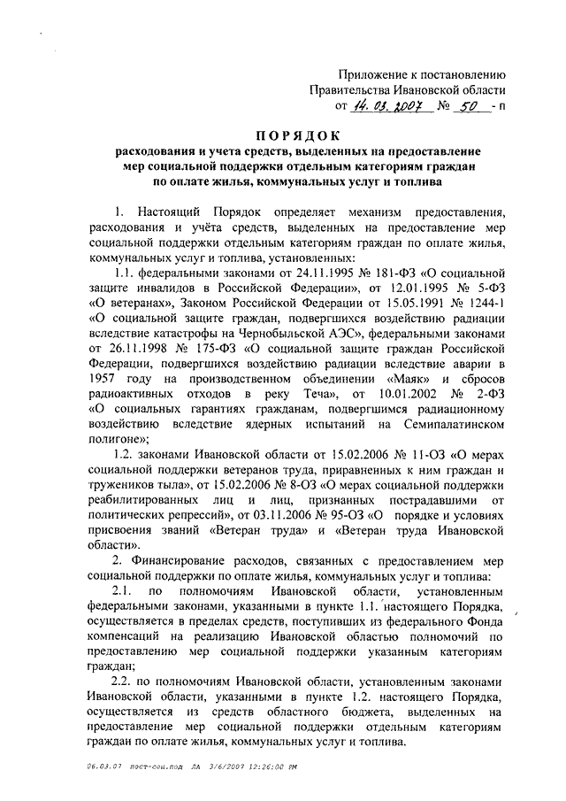 Постановление Правительства Ивановской области от 14.03.2007 N 50-п "О форме предоставления мер социальной поддержки отдельным категориям граждан по оплате жилья, коммунальных услуг и топлива и об утверждении Порядка расходования и учета средств, выделенных на предоставление мер социальной поддержки отдельным категориям граждан по оплате жилья, коммунальных услуг и топлива"