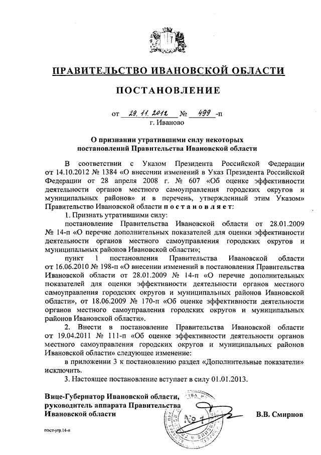 Постановление Правительства Ивановской области от 29.11.2012 N 499-п "О признании утратившими силу некоторых постановлений Правительства Ивановской области"