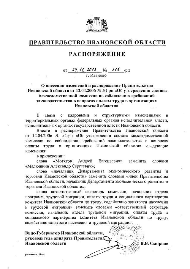 Распоряжение Правительства Ивановской области от 29.11.2012 N 316-рп "О внесении изменений в распоряжение Правительства Ивановской области от 12.04.2006 N 54-рп "Об утверждении состава межведомственной комиссии по соблюдению требований законодательства в вопросах оплаты труда в организациях Ивановской области"