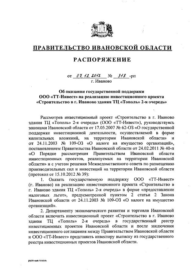 Распоряжение Правительства Ивановской области от 07.12.2012 N 318-рп "Об оказании государственной поддержки ООО "ТТ-Инвест" на реализацию инвестиционного проекта "Строительство в г. Иваново здания ТЦ "Тополь" 2-я очередь"
