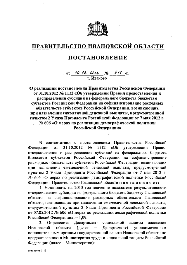 Постановление Правительства Ивановской области от 10.12.2012 N 518-п "О реализации постановления Правительства Российской Федерации от 31.10.2012 N 1112 "Об утверждении Правил предоставления и распределения субсидий из федерального бюджета бюджетам субъектов Российской Федерации на софинансирование расходных обязательств субъектов Российской Федерации, возникающих при назначении ежемесячной денежной выплаты, предусмотренной пунктом 2 Указа Президента Российской Федерации от 7 мая 2012 г. N 606 "О мерах по реализации демографической политики Российской Федерации"