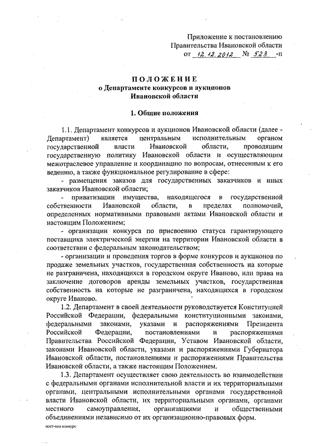 Постановление Правительства Ивановской области от 12.12.2012 N 523-п "Об утверждении Положения о Департаменте конкурсов и аукционов Ивановской области и внесении изменений в постановление Правительства Ивановской области от 15.02.2006 N 10-п "О создании Департамента конкурсов и аукционов Ивановской области"