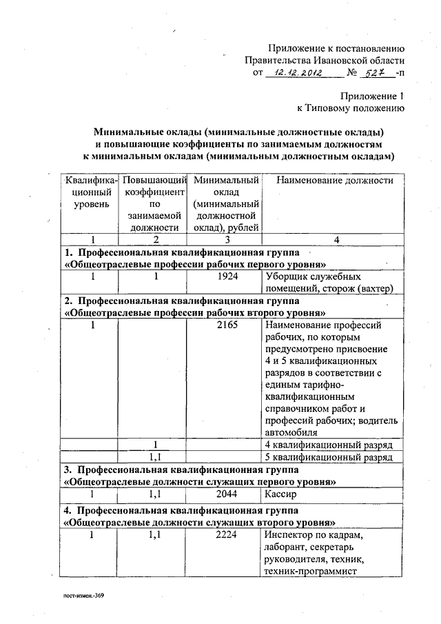 Постановление Правительства Ивановской области от 12.12.2012 N 527-п "О внесении изменения в постановление Правительства Ивановской области от 31.12.2008 N 369-п "О системах оплаты труда работников государственных учреждений Ивановской области, подведомственных службе по охране объектов животного мира Ивановской области"