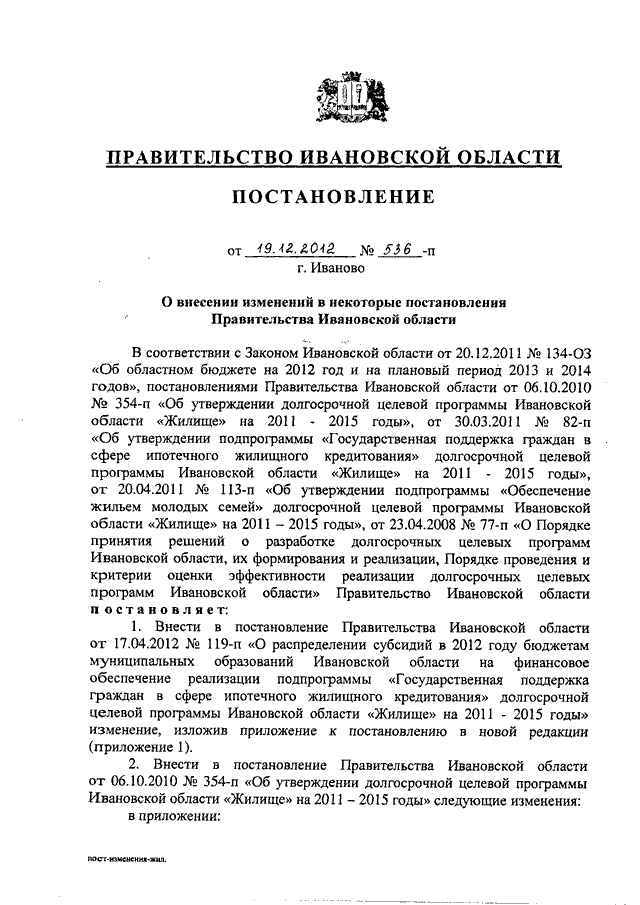 Постановление Правительства Ивановской области от 19.12.2012 N 536-п "О внесении изменений в некоторые постановления Правительства Ивановской области"