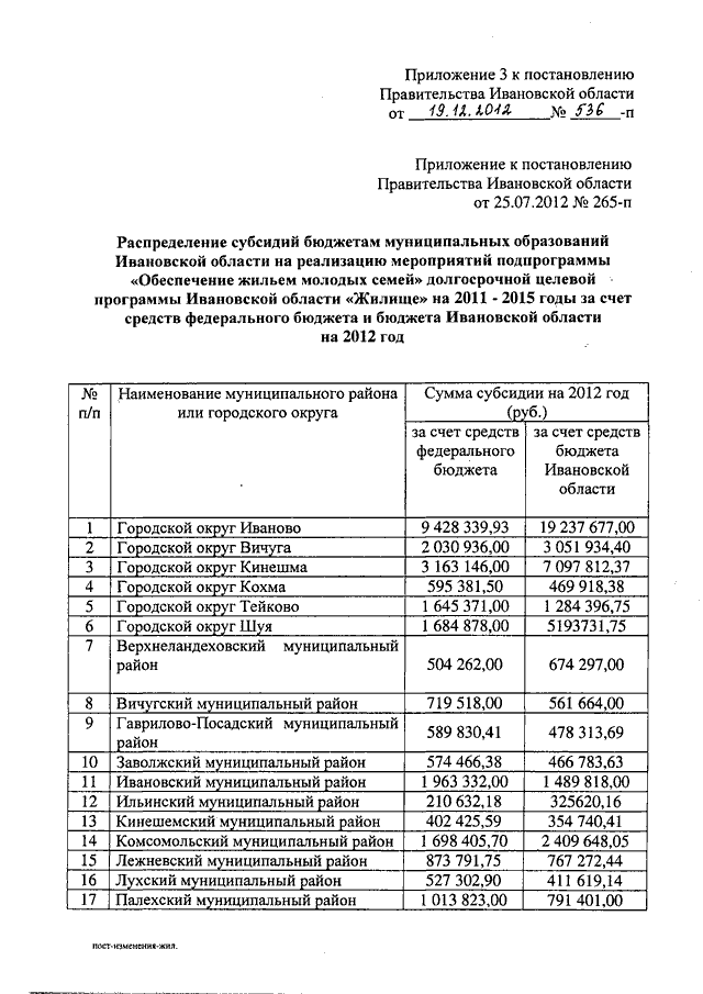 Постановление Правительства Ивановской области от 19.12.2012 N 536-п "О внесении изменений в некоторые постановления Правительства Ивановской области"