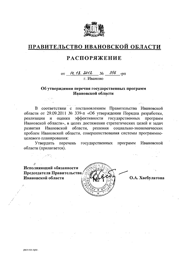 Распоряжение Правительства Ивановской области от 14.12.2012 N 356-рп "Об утверждении перечня государственных программ Ивановской области"
