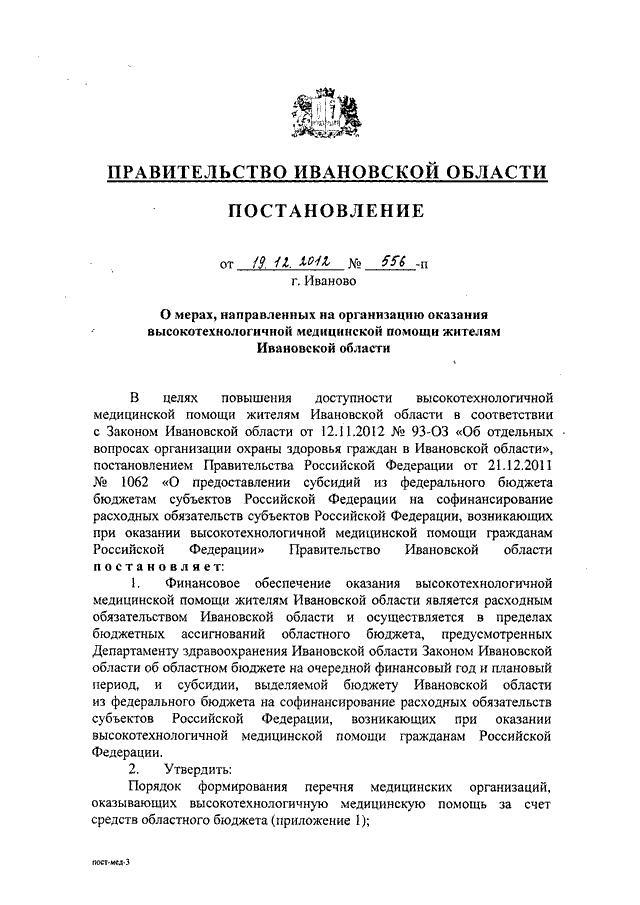 Постановление Правительства Ивановской области от 19.12.2012 N 556-п "О мерах, направленных на организацию оказания высокотехнологичной медицинской помощи жителям Ивановской области" (вместе с "Порядком формирования перечня медицинских организаций, оказывающих высокотехнологичную медицинскую помощь за счет средств областного бюджета", "Порядком финансового обеспечения оказания высокотехнологичной медицинской помощи за счет средств областного бюджета")