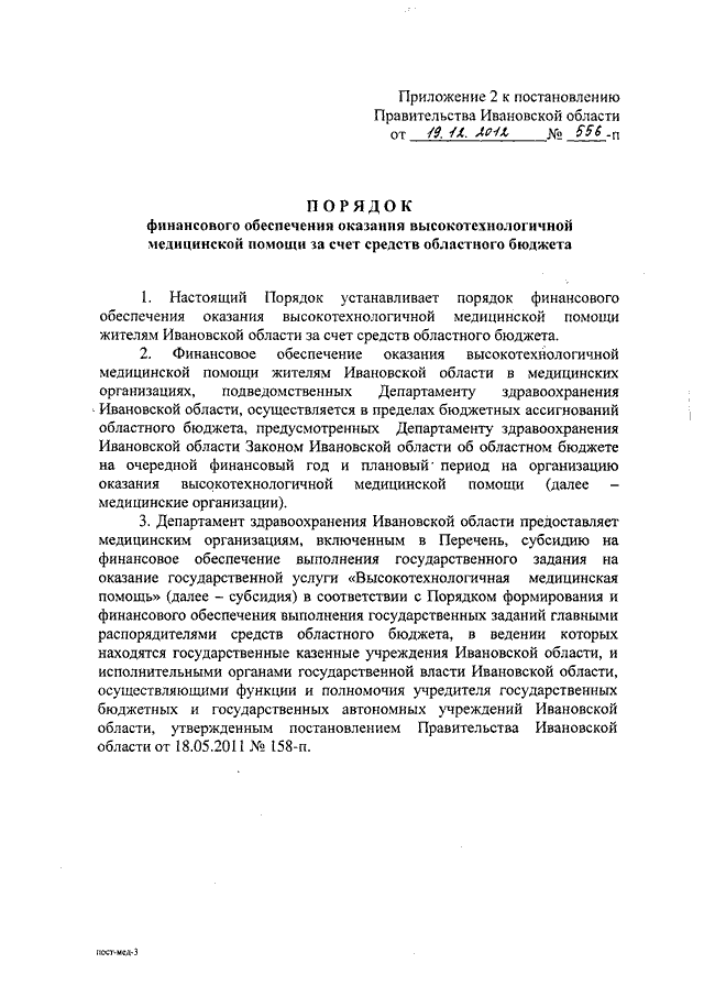 Постановление Правительства Ивановской области от 19.12.2012 N 556-п "О мерах, направленных на организацию оказания высокотехнологичной медицинской помощи жителям Ивановской области" (вместе с "Порядком формирования перечня медицинских организаций, оказывающих высокотехнологичную медицинскую помощь за счет средств областного бюджета", "Порядком финансового обеспечения оказания высокотехнологичной медицинской помощи за счет средств областного бюджета")