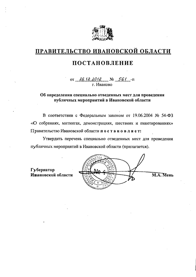 Постановление Правительства Ивановской области от 26.12.2012 N 561-п "Об определении специально отведенных мест для проведения публичных мероприятий в Ивановской области" (вместе с "Перечнем специально отведенных мест для проведения публичных мероприятий в Ивановской области")