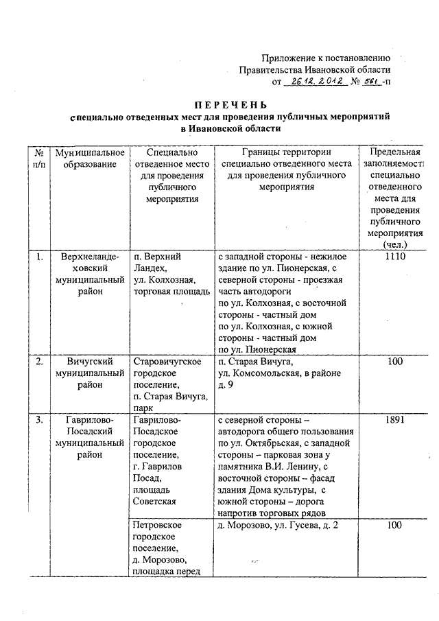 Постановление Правительства Ивановской области от 26.12.2012 N 561-п "Об определении специально отведенных мест для проведения публичных мероприятий в Ивановской области" (вместе с "Перечнем специально отведенных мест для проведения публичных мероприятий в Ивановской области")