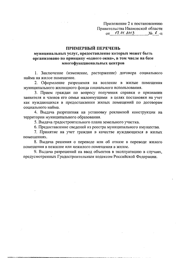 Постановление Правительства Ивановской области от 17.01.2013 N 6-п "Об утверждении перечня государственных услуг, предоставление которых организуется в многофункциональных центрах предоставления государственных (муниципальных) услуг исполнительными органами государственной власти Ивановской области" (вместе с "Примерным перечнем муниципальных услуг, предоставление которых может быть организовано по принципу "одного окна", в том числе на базе многофункциональных центров")