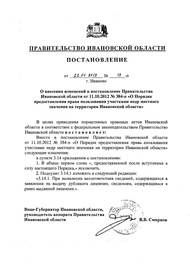 Постановление Правительства Ивановской области от 22.01.2013 N 13-п "О внесении изменений в постановление Правительства Ивановской области от 11.10.2012 N 384-п "О Порядке предоставления права пользования участками недр местного значения на территории Ивановской области"