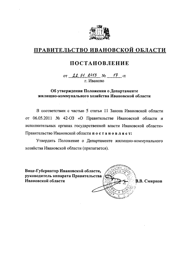 Постановление Правительства Ивановской области от 22.01.2013 N 17-п "Об утверждении Положения о Департаменте жилищно-коммунального хозяйства Ивановской области"