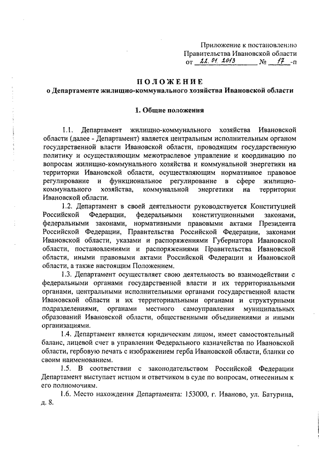 Постановление Правительства Ивановской области от 22.01.2013 N 17-п "Об утверждении Положения о Департаменте жилищно-коммунального хозяйства Ивановской области"