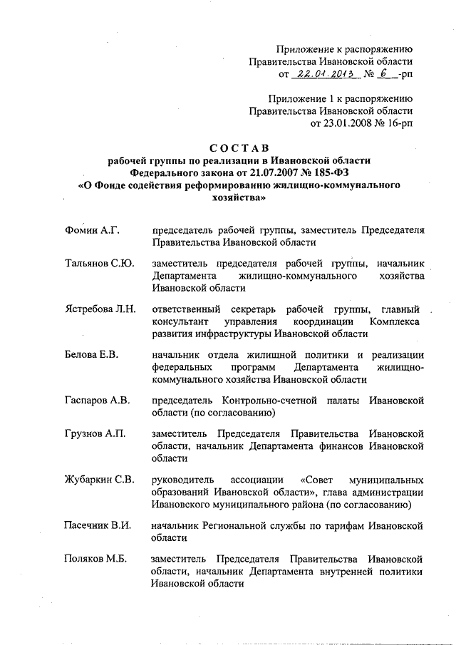 Распоряжение Правительства Ивановской области от 22.01.2013 N 6-рп "О внесении изменений в распоряжение Правительства Ивановской области от 23.01.2008 N 16-рп "О мерах по реализации в Ивановской области Федерального закона от 21.07.2007 N 185-ФЗ "О Фонде содействия реформированию жилищно-коммунального хозяйства"